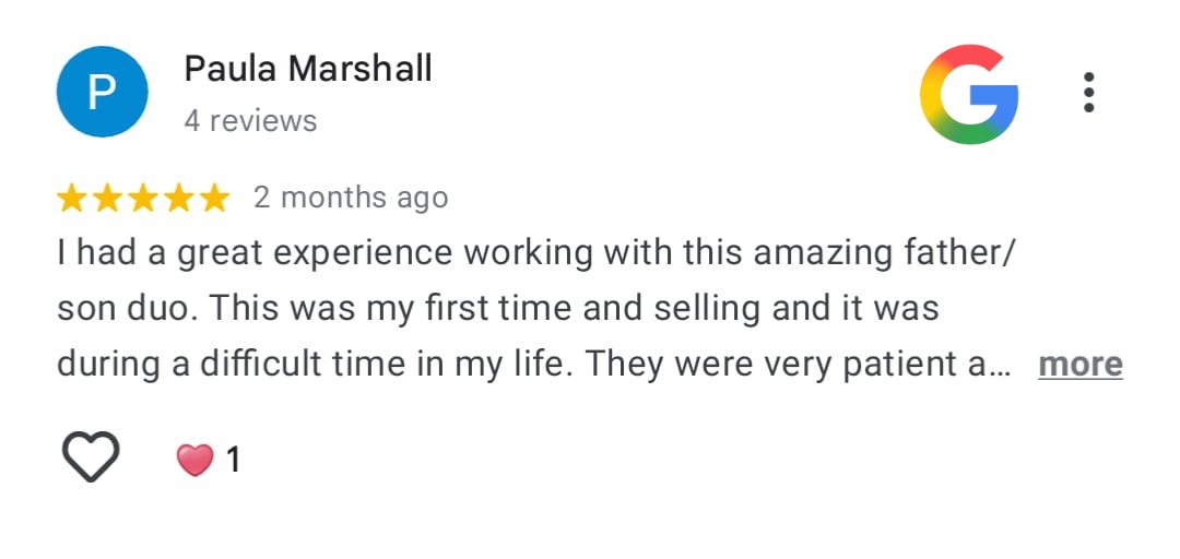 “I had a great experience working with this amazing father/son duo. This was my first time and selling and it was during a difficult time in my life.”